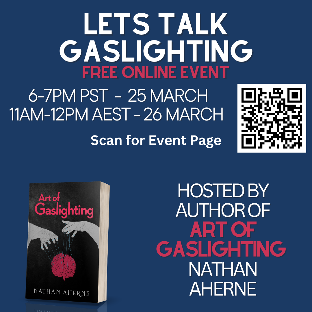 25th of March 2025 at 6pm PST time (San Francisco time) Nathan Aherne will be hosting a FREE online event to discuss everything Gaslighting. This event is for people who want to know more about gaslighting. Ask Nathan any questions they might have about the book or gaslighting.